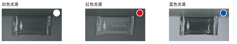 光源顏色對(duì)視覺檢測(cè)效果有什么影響呢?來看一個(gè)例子,將紅色的糖果包裝紙放入棕色紙盒中,圖中顯示了使用白色、紅色和藍(lán)色光源時(shí)各自的對(duì)比度水平。