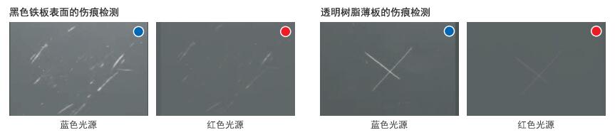第2組圖是藍(lán)色光源和紅色光源分別對(duì)黑色鐵板和透明樹脂薄板的傷痕檢測(cè)。
