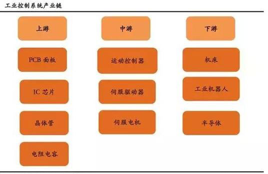 控制系統(tǒng)上游包括各類電子元器件,如PCB面板、IC芯片、晶體管、電阻電容等,中游核心部件包含運(yùn)動(dòng)控制器、伺服驅(qū)動(dòng)器、伺服電機(jī)等,下游運(yùn)用于工業(yè)機(jī)器人、半導(dǎo)體、機(jī)床等各行各業(yè)。