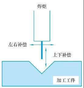 機(jī)器人自主焊接,為焊接機(jī)器人加上跟蹤功能,通過傳感設(shè)備實(shí)現(xiàn)對(duì)焊縫的數(shù)據(jù)進(jìn)行采集、分析,獲取焊縫的尺寸、坐標(biāo)、形狀等信息,按照事先設(shè)定的增益、偏差等參數(shù)值,對(duì)焊槍上下和左右方向進(jìn)行補(bǔ)償。
