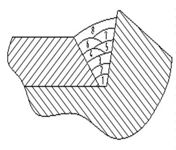 如果焊接焊腳尺寸大于12mm以上的焊件時(shí),可采用三層六道、四層十道來(lái)完成, 如下圖所示。焊腳尺寸越大,焊接層數(shù)、道數(shù)就越多。