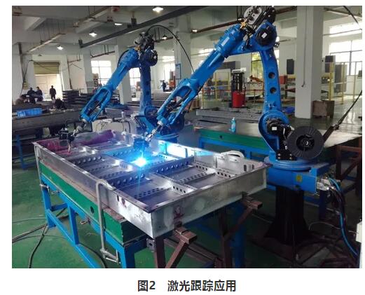 在實際自動焊接過程中,激光焊縫跟蹤器的作用是對焊縫做精確的定位。一個完整的焊縫檢測跟蹤系統(tǒng)通常由激光結(jié)構(gòu)光傳感器、控制器及執(zhí)行機構(gòu)組成,它們構(gòu)成了一個完整的閉環(huán)控制系統(tǒng),實現(xiàn)了檢測、計算和執(zhí)行的功能。在實際使用中執(zhí)行機構(gòu)有可能是由伺服電動機、直線導(dǎo)軌滑臺組成的焊接專機,也可能是焊接機器人。控制器一般為工控機或FPGA、DSP等嵌入式處理器。除此以外,一般還包括焊接電源、工裝夾具及上下料機構(gòu)等。機器人自動焊接工作站就是一種典型的應(yīng)用,首先通過視覺傳感器尋位確定工件及焊縫的位置,修正真實焊縫的焊接起始位置,在焊接過程中啟動實時跟蹤,通過實時的控制機器人不斷修正機器人的焊接軌跡,達到準確的自動焊接(見圖2)。目前常用的跟蹤控制方式有無標定的模糊跟蹤、標定實時跟蹤、尋位及跟蹤+尋位方式。無標定的模糊跟蹤不需要精確標定實時檢測焊槍與焊縫的偏差,并實時地做趨勢微調(diào)控制。標定實時跟蹤檢測的是焊縫的實際絕對位置,同時控制焊槍運動到焊縫的實際絕對位置。尋位方式指焊接時不實時跟蹤,在焊接前通過兩點或多點尋位確定當前焊縫或工件的位置,提前修改執(zhí)行機構(gòu)的運動軌跡,從而實現(xiàn)精確的焊接。跟蹤+尋位方式則是標定實時跟蹤與尋位方式的結(jié)合。