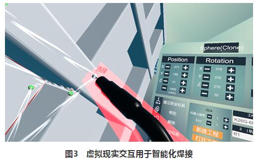 (3)虛擬現(xiàn)實仿真與人機交互技術(shù)。在目前的智能化焊接中,技術(shù)人員通過Unity3D在虛擬仿真與人機交互技術(shù)實現(xiàn)了虛擬現(xiàn)實交互的焊接(見圖3)。人機交互界面負責機器人運動信息反饋和機器人的控制,人再通過人機交互界面對焊接機器人實施遠端操作,從而達到人機交互,在一定程度上可以替代示教編程及離線編程。在復(fù)雜、惡劣的環(huán)境中將遠端焊接機器人與虛擬現(xiàn)實結(jié)合起來并實施人機交互,既能保證焊接工人的安全又能高效地完成焊接作業(yè)。