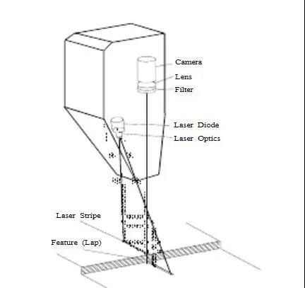 焊接跟蹤傳感器頭部包括一個CCD攝像機(jī)和一個或兩個半導(dǎo)體激光器。激光器作為結(jié)構(gòu)光源,以預(yù)定的角度將激光條紋投影到傳感器下部的工件表面。攝像機(jī)直接觀察在傳感器下部的條紋。攝像機(jī)前部是一個光學(xué)濾光片,允許激光通過但是濾去所有其他的光,例如焊接電弧。傳感器因此能夠非常接近焊接電弧。