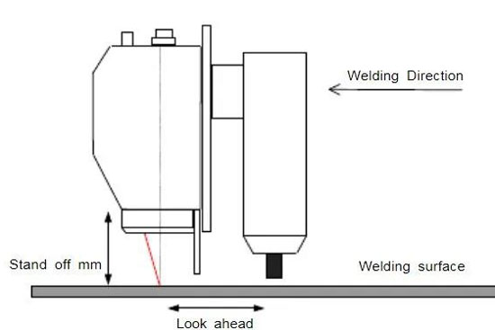 傳感器通常以預(yù)先設(shè)定的距離(超前)安裝在焊槍前部,因此它可以觀察焊縫。傳感器本體到工件的距離也就是安裝高度取決于所安裝的傳感器型號。當(dāng)焊槍在焊縫上方正確的定位后,焊縫應(yīng)該接近條紋的中心,這才能使得攝像機(jī)觀察到激光條紋和焊縫。