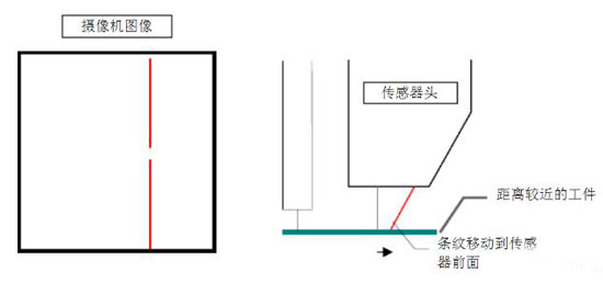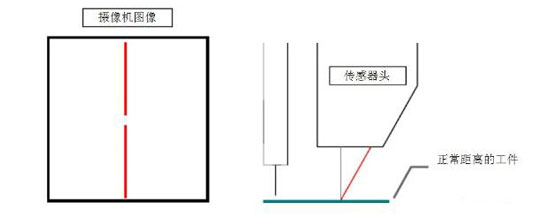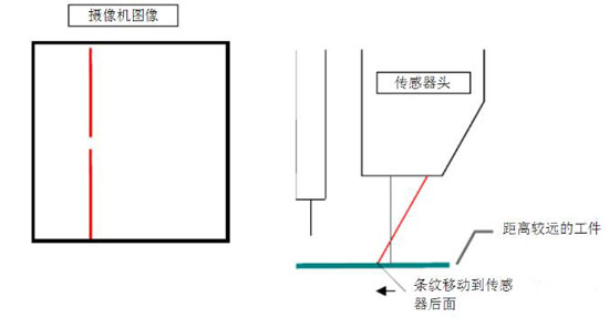 由于激光條紋是以一定的角度投影的,如果工件同傳感器距離太近,激光條紋的位置就相對靠前。反過來,如果工件同傳感器距離遠(yuǎn)一些,工件表面激光條紋的位置相對靠后。攝像機(jī)觀察激光條紋的位置,傳感器能夠測量距離工件的垂直距離。從條紋的形狀上看,傳感器也能夠測量表面的輪廓和焊縫在條紋上的位置,這就允許傳感器測量焊縫的橫向位置。