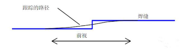 從攝像機(jī)觀察到的圖像被控制器處理,圖像首先被獲取并形成數(shù)字化的激光條紋圖像。然后軟件使用特定的設(shè)置來將條紋分成形成焊縫的許多條線。從這些線的位置,系統(tǒng)可以測量焊縫的位置,并將其轉(zhuǎn)化成以mm計算的距離。這種轉(zhuǎn)化是使用在傳感頭中存儲的校準(zhǔn)數(shù)據(jù)完成的。當(dāng)系統(tǒng)正在進(jìn)行跟蹤時,焊接速度和前視距離被用來計算延遲時間。這就保證焊槍而不是傳感器沿著焊縫行進(jìn)。應(yīng)該指出的是控制策略提供了平滑的前視距離以保證形成平滑的焊縫。因此如果傳感器在路徑上遇到了一個臺階的變化,他將會提供一個平滑的響應(yīng),如下圖所示。