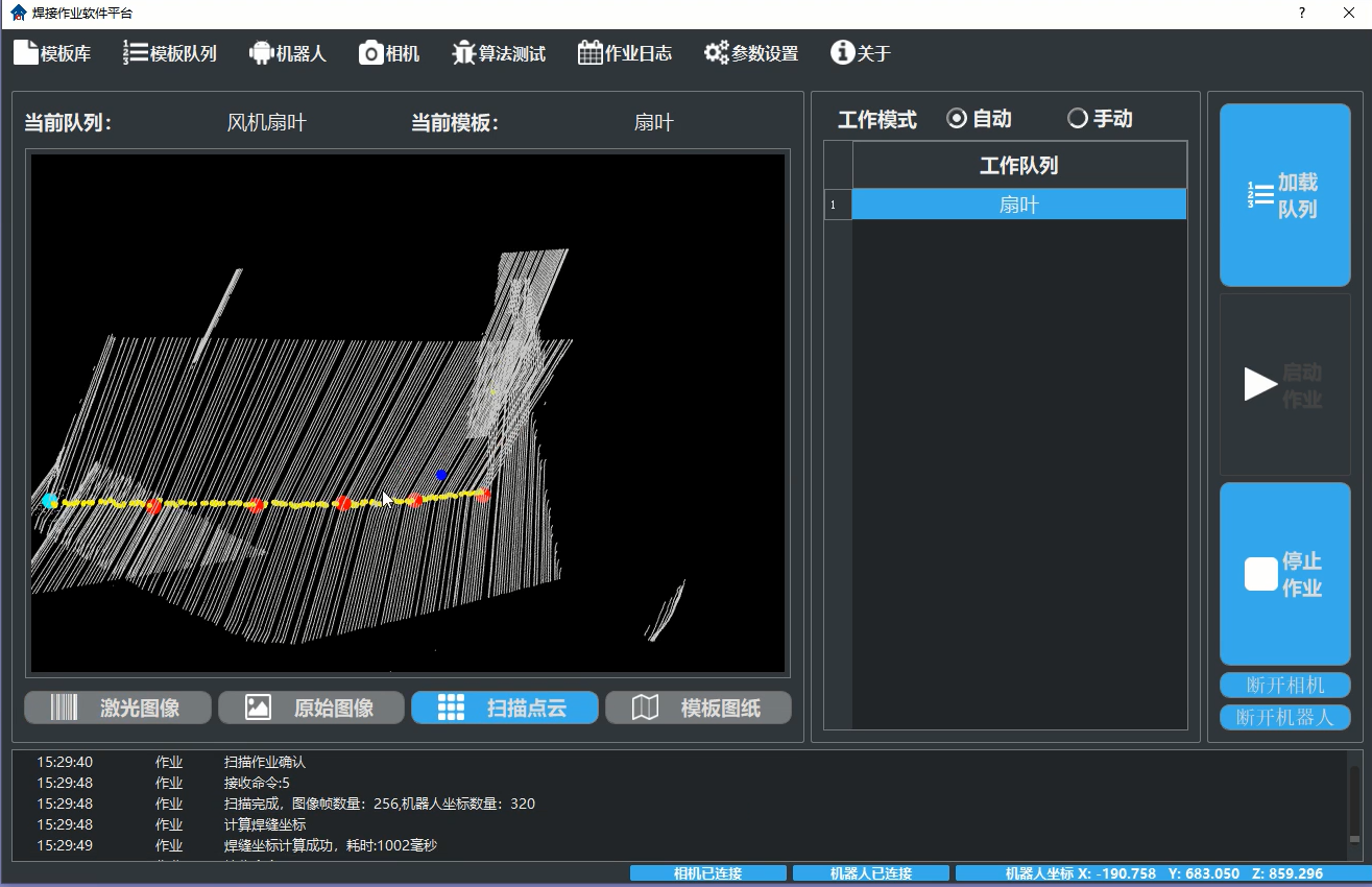 扇葉掃描可以對軸流式-離心式扇葉進(jìn)行掃描自動焊接。機(jī)器人配合高距離傳感器,掃描出整條焊縫點(diǎn)云數(shù)據(jù),再上傳到工控機(jī)軟件上,進(jìn)行焊縫軌跡計算識別,并輸出六個點(diǎn)位到機(jī)器人實(shí)行焊接,控制變位機(jī)可進(jìn)行循環(huán)掃描焊接。