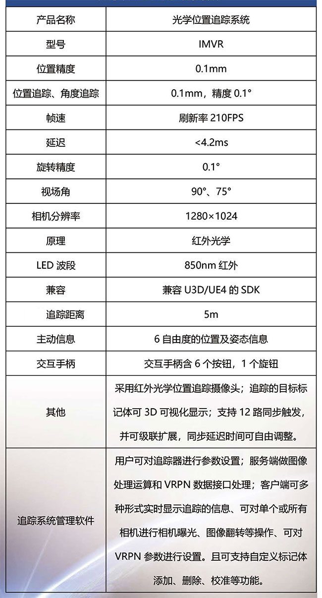 光學(xué)位置追蹤系統(tǒng)是專用于大場地、多人互動(dòng)的虛擬現(xiàn)實(shí)光學(xué)位置追蹤系統(tǒng),由VR系列智能攝像機(jī)、系統(tǒng)調(diào)試軟件、空間標(biāo)定套件、合作目標(biāo)套件、游戲引擎SDK包等組成。光學(xué)位置追蹤系統(tǒng)可滿足VR空間中人與虛擬場景的交互、人與人的交互、人與現(xiàn)場世界物體的交互,亞毫米級運(yùn)動(dòng)捕捉,低延時(shí)在4.2ms以內(nèi)。